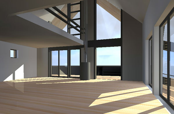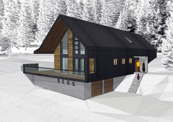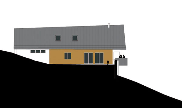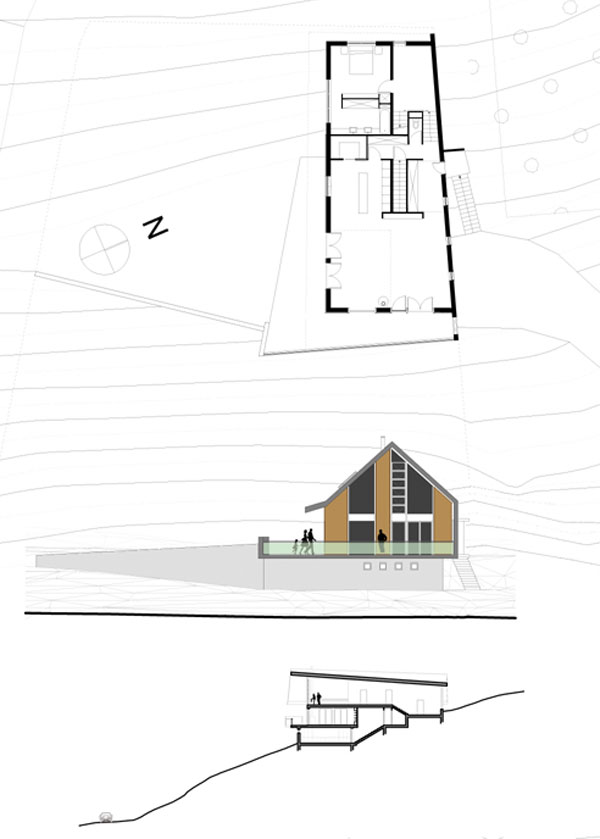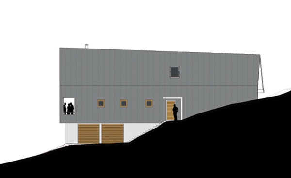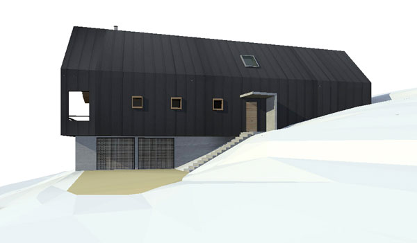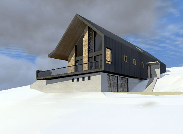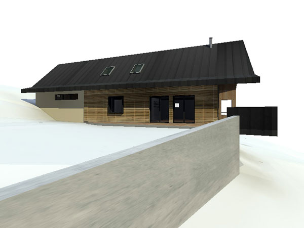 Le volume habitable en ossature bois est posé sur le socle maçoné encastré dans la pente. Le volume habitable est développé en «demi niveaux» pour faciliter l’insertion de la maison dans la pente. La couverture en zinc se prolonge et recouvre la façade nord. Le faîtage est incliné, montant vers l’Est et permet de profiter au mieux de la vue sur les montagnes depuis le salon et la mezzanine.