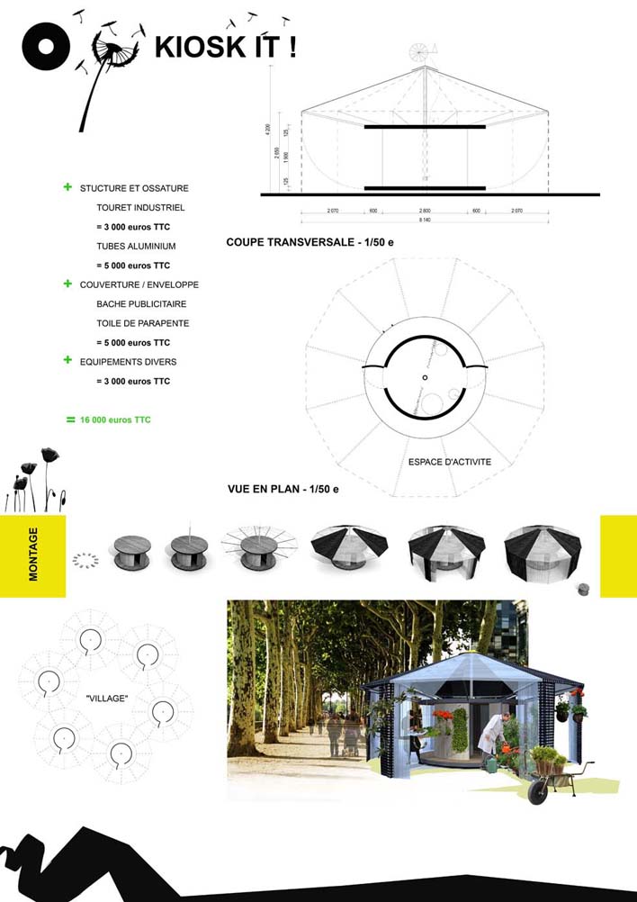 Le projet est un kiosk pour fleuriste, marchand de journaux etc. réalisés à partir de tourets de cable industriels et de bâches de camion recyclées.
