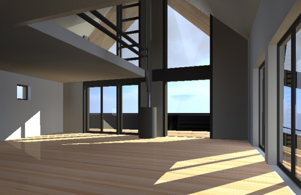 Le volume habitable en ossature bois est posé sur le socle maçoné encastré dans la pente. Le volume habitable est développé en «demi niveaux» pour faciliter l’insertion de la maison dans la pente. La couverture en zinc se prolonge et recouvre la façade nord. Le faîtage est incliné, montant vers l’Est et permet de profiter au mieux de la vue sur les montagnes depuis le salon et la mezzanine.